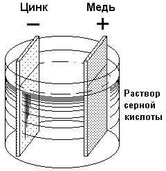 Если отсутствует электрическая сеть, то для питания электроприборов применяют гальванические элементы и аккумуляторы, называемые иначе химическими источниками тока. Рассмотрим принцип их работы на примере первого простейшего элемента – элемента Вольта (рис. 1). Он состоит из медной (Сu) и цинковой (Zn) пластинок, опущенных в раствор серной кислоты (H2 SO4 ). Вследствие химической реакции, происходящей между цинком и серной кислотой, на цинке образуется излишек электронов. Цинк заряжается отрицательно и является отрицательным полюсом. Раствор и медная пластинка, в него погруженная, заряжаются положительно. В результате возбуждается ЭДС, равная примерно одному вольту, которая сохраняется все время, пока цепь не замкнута.