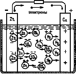Работа гальванических элементов объясняется с помощью теории электролитической диссоциации, согласно которой молекулы вещества, растворенного в воде распадаются (диссоциируют) на, ионы. Такое явление характерно для всех электролитов, представляющих собой растворы кислот, щелочей и солей. В элементе Вольта молекула серной кислоты (H2 SO4 ) в водном растворе распадаются на отрицательный ион кислотного остатка (SO4 ) и положительный ион водорода (H2 ), что показано на рис. 2.