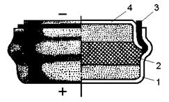 1 – стальной корпус с положительным электродом; 2 – пористая прокладка; 3 – резиновая уплотняющая прокладка; 4 – крышка корпуса с отрицательным электродом.