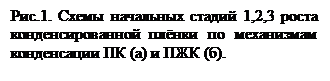 Рассмотренные механизмы кристаллизации определяют различные характеры формирования и роста плёнки из паровой фазы, что в конечном счёте определяет свойства плёнок. Схематически механизмы конденсации ПК и ПЖК показаны на рис. 1. Если конденсируемые атомы связаны с собой сильнее, чем с поверхностью нейтральной подложки, они свободно и достаточно интенсивно мигрируют с её поверхности. При достаточно высокой плотности потока испаряемого вещества на поверхности подложки образуются зародыши кристаллической фазы или жидкой конденсированной фазы, которые сначала разрастаются сначала в двух (Рис.1, б, стадия 3), я затем и в трёх направлениях. Если же силы взаимной связи атомов или молекул конденсирующегося вещества меньше сил их связи с подложкой, резко возрастает влияние кинетических параметров подложки на процесс формирования плёнки по механизму ПК. В таблице 1 даны примеры механизмов конденсации различных металлов на аморфных подложках. Следует отметить, что механизм конденсации зависит (в первом приближении) от соотношения температур подложки Tп