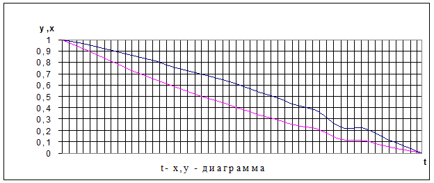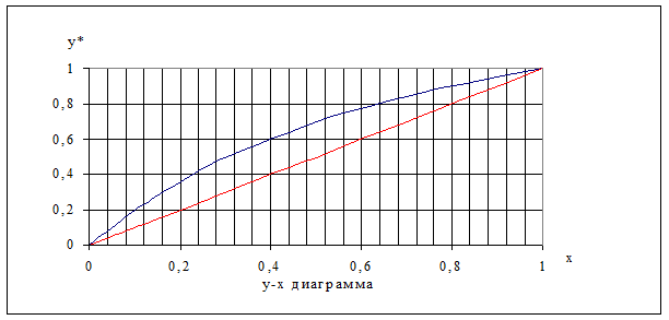 Для нахождения температуры, при которой ведётся конденсация воспользуемся tx (y) диаграммой. В основе построения лежат законы Дальтона, Рауля и Рауля – Дальтона. Это рабочая диаграмма зависимости температуры кипения жидкости от состава и температуры конденсации пара в зависимости от его состава. Состав бинарной смеси всегда определяется по низкокипящему компоненту.