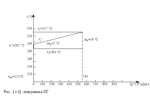 Характерные пара изменения температуры вдоль поверхности нагрева представлены на t-Q диаграмме