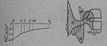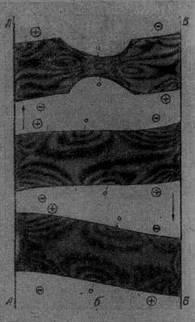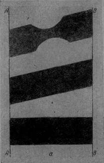 Для проверки к двум параллельным жестким планкам АА и ВВ приклеивали три резиновые пластины (рис. 3,а), оси которых различно ориентированы по отношению к осям планок. При перемещении планки ВВ в плоскости пластин, параллельно планке АА, во всех трех пластинах возникает напряженное состояние. Просвечивание этих моделей в поляризованном свете показало, что на свободном контуре образуются как сжатые так и растянутые участки (рис. 3, б) (получить только сжатый контур невозможно). Точки О—нулевые; слева и справа от них возникают соответственно растягивающие Å и сжимающие Q напряжения.