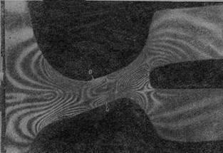 В монохроматическом свете обе системы полос черные и отчетливо видны изохромы высокого порядка. В экспериментах были получены полосы 70-го порядка, т. е., учитывая размеры моделей, до 5 полос на 1 мм.