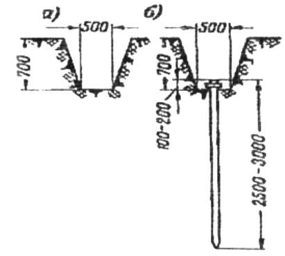 Рис 2. Установка трубчатого заземлителя в траншее а) траншея б) расположение электрода в грунте |