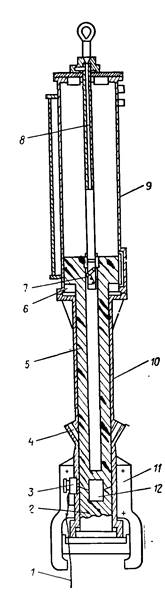 / — канат управления топливным насосом; 2— шабот, 3 — топливный насос высокого давления; 4 — выхлопной патрубок; 5 — поршень; 6— пневмовакуумный буфер; 7—рычажный механизм подъемного устройства; 8 — подъемное устройство; 9—направляющая труба; 10—рабочий цилиндр; 11 — устройство для крепления кпîãðужаемому элементу; 12 — камера сгорания