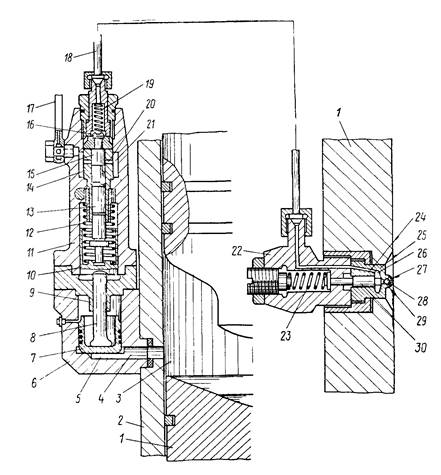 6—нижняя часть корпуса насоса; 7 — поршень; 8 — толкатель, 9 — средняя часть корима корпуса топливного насоса; 10—подвижная втулка; 11 — верхняя часть корпуса топливного насоса, 12, 23 — пружина; 13— плунжер; 14 — втулка; 15 — подплунжерная полость 1Ь — клапан- 17 — топливопровод; 18— напорный топливопровод; 19—пружина,20 - отверстия, 21, 26, 27 — полость; 22 — корпус форсунки; 25 — наконечник;26—сопловое отверстие; 29 — коническая часть иглы; 30— игла.