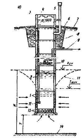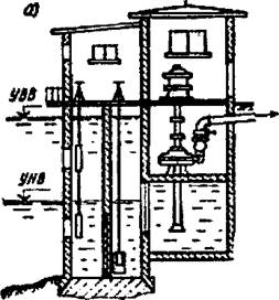 Шахтные колодцы сооружают из бетона, железобетона, кирпича, бута и дерева для приема обычно безнапорных вод при относительно небольшой глубине их залегания (до 40 м). Обычно шахтные колодцы не доходят до водоупора (колодцы несовершенного типа) и получают воду через днище и отверстия в стенках (рис. За). Шахтные колодцы имеют значительную площадь поперечного сечения и небольшую вертикальную часть. На дне и в отверстиях стен шахтных колодцев размещают фильтры для предотвращения попадания в них частиц породы.