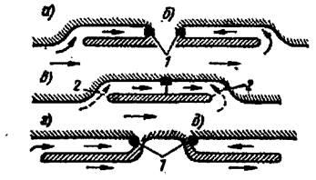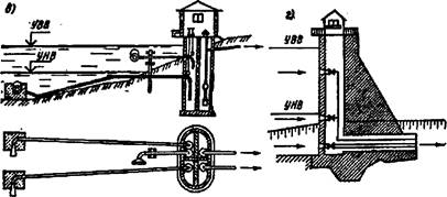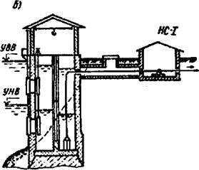 При амплитуде колебания уровней воды в источнике более 6 м и при глубинах у берега, достаточных для нормального забора воды, следует применять береговые совмещенные водозаборы (рис. 1а). Для водозаборов средней производительности при малой высоте всасывания насосов возможно совмещение берегового колодца и насосной станции. Для водозаборов небольшой производительности, при достаточных глубинах у берега для нормального забора воды можно принимать водоприемники раздельного типа (рис. 1 б). При амплитуде колебания уровней воды в источнике до 6 м и при глубинах у берега, недостаточных для забора воды, водозаборы малой производительности рекомендуется принимать руслового типа (рис. 1в), при этом насосная станция может быть конструктивно объединена с береговым колодцем или расположена отдельно.