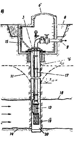 Рис. 3. Приток грунтовых (а) и напорных (б) вод соответственно к шахтному (несовершенному) и трубчатому (совершенному) колодцам: 1 - водоприемные отверстия; 2 - ствол; 3 - оголовок; 4 - крышка; 5 - вентиляционная труба; 6 - отмостка; 7 - водоотводящая канава; 8 - глиняный замок; 9 - напорный трубопровод; 10 - насос; 11 - кривая депрессии; 12 -. приемный клапан; 13 - обратный фильтр; 14 - водоупор; 15 - шахта; 16 -обсадные трубы; 17 - водоподъемные трубы; 18 - водоупорная кровля; 19 - фильтр; 20 - отстойник.