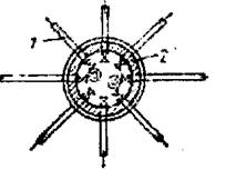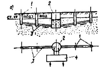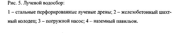 Лучевой водосбор является сооружением инфильтрационного типа, используемым для забора подрусловых и подземных вод из водоносных пластов небольшой мощности, лежащих на глубине до 20 м. Вода отбирается перфорированными трубчатыми дренами, расположенными в пределах водоносных пород и присоединяемыми радиально к сборному шахтному колодцу (рис. 5).