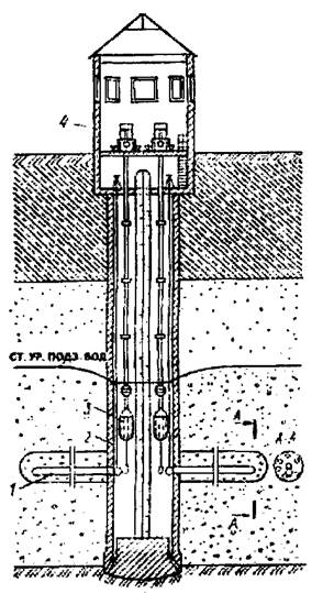I - выход подземных вод; 2 - водоприемная камера; 3 - глиняный замок;