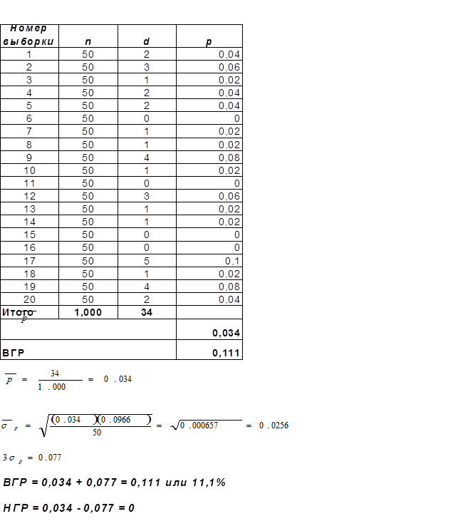 Тогда р определяется следующим образом: р (доля дефектных единиц продукции) равно общему количеству обнаруженных дефектных изделий, деленному на общее количество проверенных изделий.