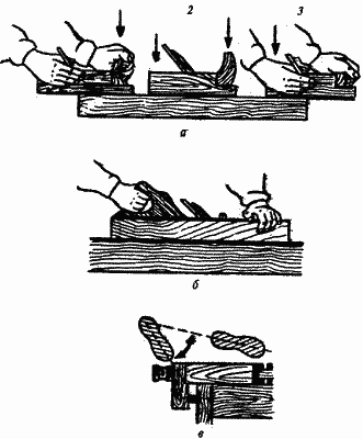 1, 2, 3 - нажим на рубанок соответственно в начале, середине и конце строгания
