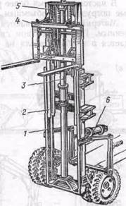 Основная рама грузоподъемника смонтирована на раме погрузчика шарнирно и вместе с кареткой может наклоняться в вертикальной плоскости на угол 3—4° вперед и 12—15° назад, что осуществляется с помощью двух гидроцилиндров 6.