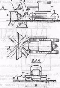 Бульдозер (рис. 8.6) представляет собой гусеничный или колесный тягач (базовая машина) с навесным оборудованием, имеющим рабочий орган в виде отвала /, соединенного с толкающими брусьями 2. Для подъема и опускания отвала служит гидроцилиндр 3.