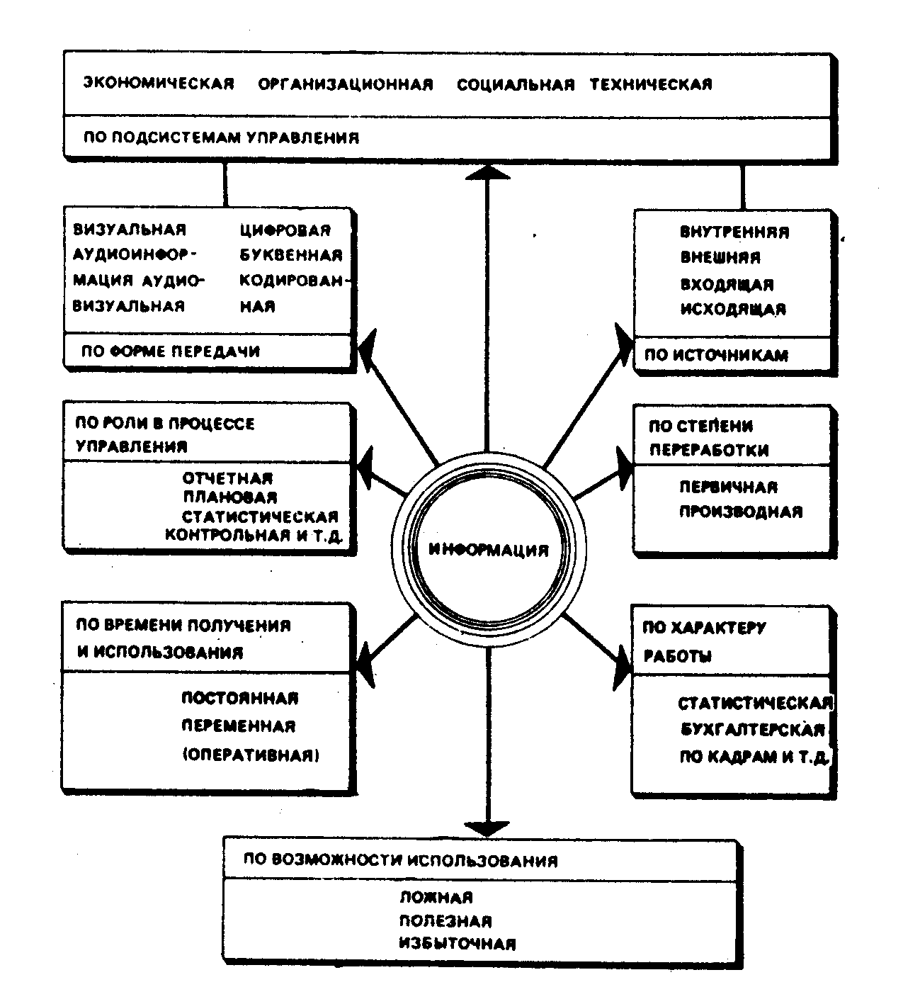 1. Информация может быть дифференцирована по подсистемам управляемой системы. По этому признаку выделяют экономическую, организационную, социальную, техническую информацию. Нередко в практике управления при разработке управленческих решений недостаточно используется социальная информация: она не всегда имеет организационную форму ее учета и применения. Это отрицательное явление в процессе управления. Встречаются недостатки, связанные с несвоевременным обновлением организационной информации, что также отрицательно сказывается на работе.