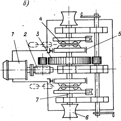 1 - двигатель; 2 - червячный редуктор; 3 - цилиндрические шестерни; 4 - цепная звездочка; 5 - ленточный тормоз; 6 - турачка (швартовный барабан); 7- грузовой вал.