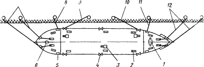1 - брашпиль со швартовными барабанами; 2 - кнехт; 3 - швартовная лебедка; 4 - швартовный клюз;5 - киповая планка;6 - швартовный шпиль; 7 - кормовой про дольный швартов (правый и левый); 8 - кормовой прижимной швартов;9 - кормовой шпринг; 10 - носовой шпринг; 11 - носовой прижимной швартов; 12 - носовые про дольные швартовы (правый и левый).