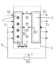 Процесс преобразования энергии в ТЭП рассмотрим вначале на примере анализа плоской вакуумной модели элементарного генератора (рис. 1.) Промежуток между металлическими электродами - катодом (эмиттером) 1 и анодом (коллектором) 2, заключенными в вакуумный сосуд 3, откачан до давления 0,133 мПа (примерно 10-6 мм рт. ст.). Электроды и их выводы 4 изолированы от стенок сосуда. К эмиттеру подводится тепловая энергия Q1, и он нагревается до температуры Т1 2000К. Коллектор поддерживается при температуре Т2 < Т1 вследствие отвода от него тепловой энергии Q2. Распределение электронов по энергиям в металле электрода зависит от его химической природы и определяется среднестатистическим уровнем Ферми. Это тот (наименьший) уровень, на котором располагались бы все электроны при температуре Т=0. Если Т>0, то вероятность наличия у электрона энергии уровня Ферми всегда равна 0,5. Вплоть до точки плавления металла уровень Ферми мало зависит от Т.