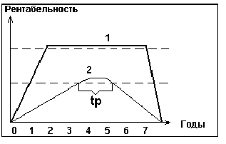 Производство изделий без надлежащей технической подготовки (см . рисунок 1 ,кривая 2) удлиняет сроки освоения (выхода на плановую рентабельность) в 2 - 2.5 раза. В этом случае рентабельный период сокращается т.к. наступает моральное старение продукции, падение спроса на нее и зачастую снижение цены на нее.