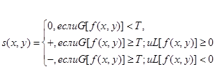 (где символы 0, +, - представляют три различных уровня освещенности, а Т— пороговый уровень. Предположим, что темный объект располагается на светлом фоне, тогда применение уравнения дает образs(x, у), в котором все пикселы, не лежащие на контуре (для них значение G[f (х, у)] меньше Т, помечены 0, все пикселы на темной стороне контура помечены + и все пикселы на светлой стороне контура помечены —. Для светлого объекта на темном фоне символы + и- в уравнении (8.2-24) меняются местами.