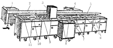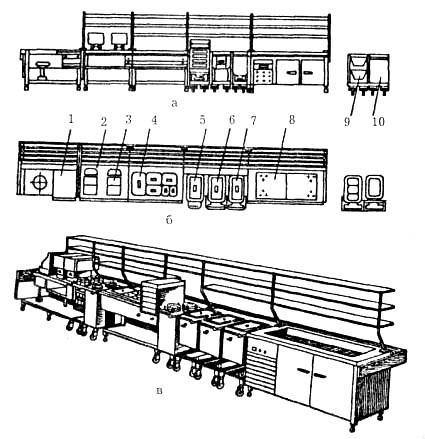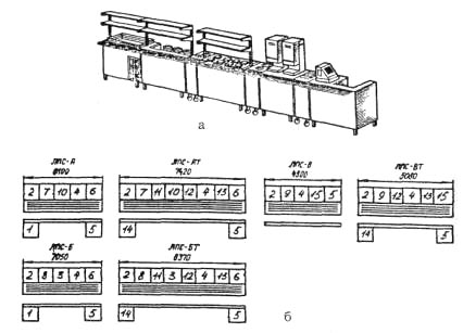 На предприятиях общественного питания используются немеханизированные линии для реализации блюд со свободным выбором (ЛПС — линия прилавков самообслуживания; ЛСБ — линия самообслуживания для буфетов; ЛС — линия самообслуживания) и для реализации комплексных обедов (ЛПС-Г, ЛПС-Д — линии прилавков самообслуживания, ЛРКО — линия для реализации комплексных обедов). Эти линии состоят из секций-прилавков для демонстрации, кратковременного хранения и отпуска холодных закусок, сладких блюд и напитков, мармитов для первых и вторых блюд, расположенных в определенной последовательности, а также из прилавков для подносов, приборов и кассового аппарата.