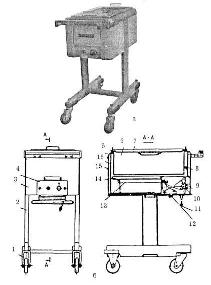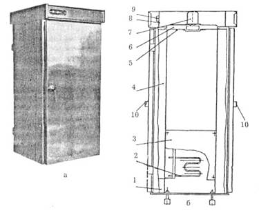а — общий вид; б — схема: 1 — облицовка; 2 — электронагреватель; 3 — лист; 4 — облицовка; 5 — баллон датчика-реле температуры; 6 — потолок; 7 — вентилятор; 8 — панель с электроаппаратурой; 9 — датчик-реле аппаратуры: 10 — двери