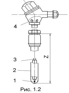 Термоэлектрический термометр представляет собой два термоэлектрода 3 (тонкие проволоки диаметром 0,5 или 1,2 мм) из разных металлов, одни концы 1 (рис. 1.2) которых сварены между собой, а к другим разомкнутым свободным концам 4 подводятся соединительные првода. Для защиты от механических повреждений и вредного воздействия среды, температура которой измеряется, термоэлектроды, армированные изоляцией, помещают в защитную арматуру 2. Термоэлектрический термометр погружают в среду температуру которой необходимо измерить, на глубину L. Концы 1 называют рабочим концом термоэлектрического термометра (он находится в измеряемой среде), а концы 4 – свободным концом (он находится обычно в помещении цеха, лаборатории).