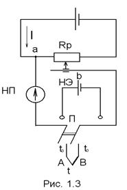 Рассмотрим принципиальную схему, иллюстрирующую компенсационный метод измерения термо-ЭДС, которая показана на рис. 1.3. Уравновешивающее падение напряжения создается уравновешивающим током I на реохорде (компенсационном резисторе) Rp. При этом сопротивление компенсационной цепи должно быть неизменным, а источник питания должен обеспечивать неизменным, во время измерения, рабочий ток I. Вдоль компенсационного резистора Rp может перемещаться скользящий контакт – движок b, который с помощью провода соединен с одним зажимом переключателя П. К зажиму a реохорда Rp присоединен один зажим нулевого прибора НП, второй его зажим присоединен к переключателю П. Таким образом, с помощью переключателя нулевой прибор можно включить в цепь термоэлектрического термометра АВ или нормального элемента НЭ с ЭДС Енэ.