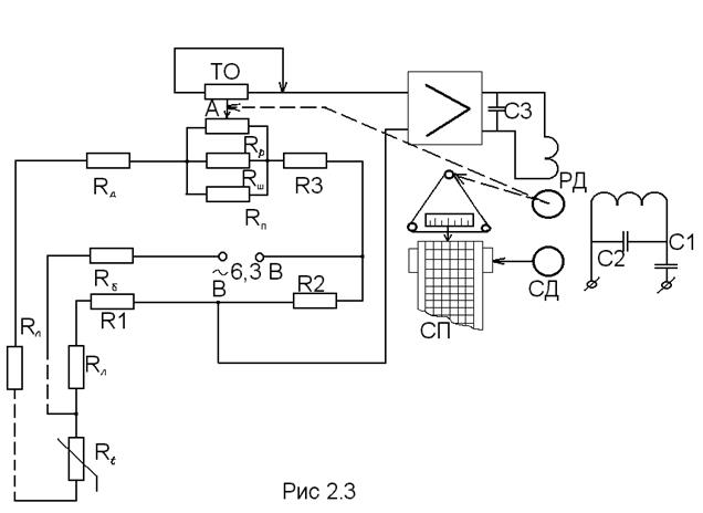 нарушает равновесие мостовой схемы, и в диагонали АВ моста возникает напряжение рассогласования, которое поступает на входной трансформатор, затем усиливается усилительным устройством (УУ) до значения, достаточного для приведения в действие реверсивного двигателя (РД). Выходной вал двигателя, вращаясь в ту или иную сторону в зависимости от знака сигнала рассогласования, перемещает движок реохорда и перо самописца (СП). При достижения равновесия мостовой схемы выходной вал двигателя останавливается, а движок реохорда, указатель и перо самописца занимают положение, соответствующее измеряемому сопротивлению термометра, а следовательно, температуре измеряемого объекта.