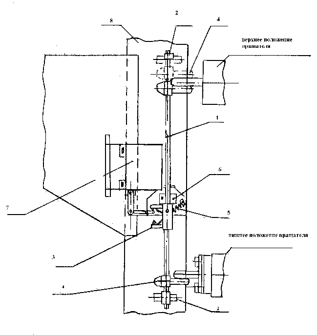 1 - тяга; 2 - опора; 3,4 - упора; 5 пружина; 6 - основание; 7 - распределитель; 8 - рама. |
