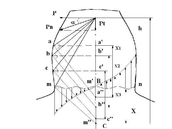 Если наибольшие контактные напряжения сдвига в зубьях возникают в тот момент, когда они зацепляются в полюсе, то наибольшие напряжения изгиба возникают тогда, когда зубья находятся в начале или конце зацепления. В этих случаях нормальное давление передается на вершину одного из зубьев. mn - опасное сечение; РТ - распорная сила; РТ = Р · tg a.
