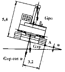 Расчет экскаватора на устойчивость (поперечную устойчивость погружателя анкерных стержней при жвижении по уклону). Расчет производиться для наиболее неблагоприятного положения экскаватора при его транспортном передвижении с поперечным. Коэффициент устойчивости: Ку = Муд , где Мопр Муд - момент удерживающий. Мопр - момент опрокидывающий; Муд= Gтр cosa · d + Gр.об. cosa ; где Gтр - вес погружателя анкерных стержней. Gр.об. - вес рабочего оборудования. Расчетная схема