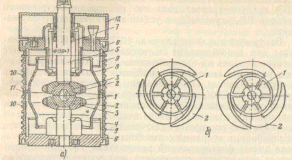а- схематический разрез камеры; б- контактная система камеы;1-контакты; 2-дугогасящие электроды; 3-зазор между контактами и дугогасящими электродами; 4-медный неподвижный ввод; 5-то же подвижный; 6- концевые фланцы; 7- сильфон из нержавеющей стали; 8- экран, изолированный от вводов; 9-концевые экраны, находящиеся под потенциалом соответствующего ввода; 10-керамические изоляторы;11-металлическая прокладка;12- напрявляющая из силумина