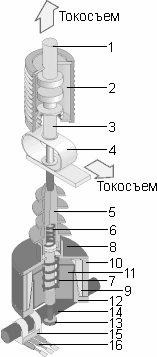 На напряжение 10 кВ разработаны вакуумные дугогасительные камеры (ВДК) с токами отключения 40 и 50 кА. На рис. 1.1 показан схематический разрез вакуумной дугогасительной камеры с поперечным магнитным дутьем с серповидными контактами, применяемой в вакуумных выключателях на номинальные напряжения 10 кВ с номинальным током 1600 А и током отключения до 31,5 кА. Поперечное магнитное поле быстро перемещает дугу, что позволяет уменьшить износ контактов и улучшает процесс гашения дуги.