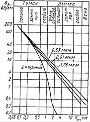 Графики зависимости коэффициента полного ослабления лазерного излучения в атмосфере от метеорологической дальности в идимости при разли чных значениях длины волны излучени я sl =f (RM ) для различных l приведены наРисунок 3 .
