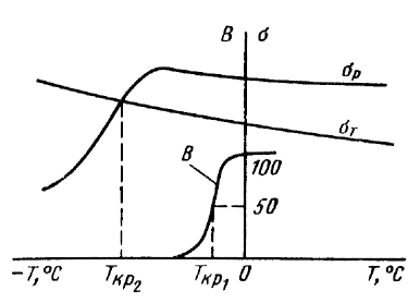 Положение Ткр2 зависит от многих факторов. Чем выше концентрация напряжений, скорость приложения нагрузки, остаточные напряжения, уровень сварочной пластической деформации, содержание газов и вредных примесей в шве, скорость охлаждения при сварке, приводящая к закалке, крупнее зерно и больше сечение испытываемого элемента, а также хуже защита металла при сварке, тем правее располагается Ткр2 , смещаясь в сторону положительных температур. При крайне неблагоприятных сочетаниях отрицательных факторов в ограниченной области сварного соединения свойства металла существенно ухудшаются, при этом Ткр2 может оказаться даже правее Ткр1 .