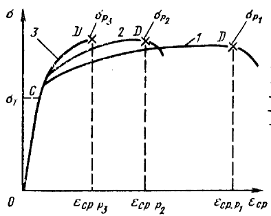Преимуществом испытания для определения sр является его простота. Недостаток состоит в том, что, проводя испытания конструкционного элемента при конкретной температуре Т выше Ткр2 и получая коэффициент запаса прочности ns =sр /sт >1, нельзя судить о запасе пластичности и о возможности наступления хрупкого разрушения. Это объясняется тем, что на диаграмме в координатах напряжение - средняя деформация eср. в опасном сечении при изменении концентрации напряжений, свойств металла и т. п. Точка разрушения D смещается в основном по горизонтали, в то время, как средняя разрушающая деформация eср.р изменяется существенно.