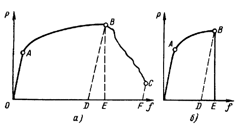 Площадь фигуры ОАВD представляет собой работу пластической деформации образца на стадии до начала движения трещины, площадь DВЕ - накопленную энергию упругой деформации, площадь DBCF является работой пластической деформации образца во время продвижения трещины. При хрупком распространении трещины ( рис. б ) удается определить только работу пластической деформации изгиба - площадь OABD. Вертикальный участок диаграммы по линии ВЕ указывает лишь на то, что работа, истраченная на распространение трещины, меньше величины энергии упругой деформации, выражаемой площадью DBE, но какова она в действительности, установить невозможно.