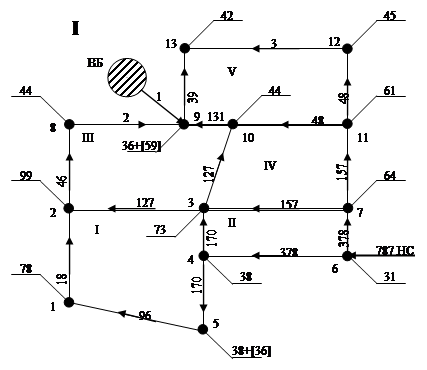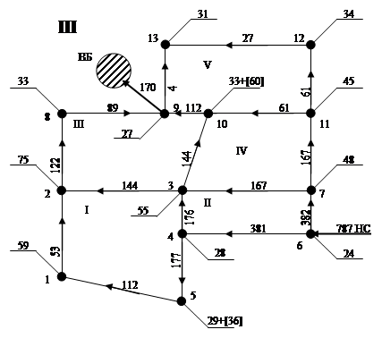 Расчет выполняется на ЭВМ. Для выполнения расчета делаем предварительное потокораспределение. Потокораспределение выполняем исходя из I закона Кирхгофа, считая, что сколько воды пришло в узел столько и вышло из него.