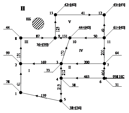 Гидравлический расчет выполняется методом Лобачева-Кросса. Этот метод основан на решении систем уравнений относительно расходов воды. При этом поправочные расходы определяют без учета взаимного влияния колец в сети, в связи с этим необходимо проводить несколько повторных определений Δq и невязок Δh, кольцевой сети. Условие: Δh=0 может быть получено во всех кольцах путем проведения по контуру каждого кольца некоторого фиксированного расхода воды в направлении обратном знаку невязки кольца.