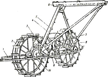 1 - стеблевод; 2 - колесо; 3 - ось; 4 - кожух мотор-редуктора; 5 - рама; 6 - желоб; 7 - мотор-редуктор; 8 - звездочка натяжная; 9 - цепная передача; 10 - передача зубчатая цилиндрическая.