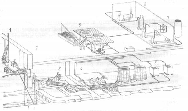 1 – забивка инъектора электрокором; 2 – то же, пневмомолотом; 3 – пультовые распределители реактива; 4 – насосная; 5 – силикаторазварочный узел; 6 – котельная; 7 – компрессорная; 8 – емкости для растворов CaCl2 .