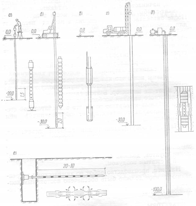 При закреплении грунта на глубину до 20 м применяют инъектор, состоящий из наголовника, колонн глухих звеньев труб, перфорированного звена, наконечника и соединительных частей-ниппелей. Забивку инъектора на глубину до 20 м в песчаные и лессовые грунты можно осуществлять отбойными молотками (рис. 2, а).