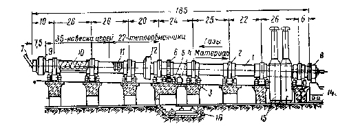 В середине печи, на одной из ее опор, устанавливается пара роликов (горизонтально) для контроля за смещением печи вдоль оси (вниз или вверх). Вспомогательный привод включается в работу при ремонтах печи, в период розжига и остановки, когда печь должна вращаться медленно. Шлам подается в питательную трубу 7 при помощи ковшовых или объемных дозаторов, находящихся у холодного конца печи. Со стороны головки 8 в печь подается топливо и воздух; в результате сгорания топлива получаются горячие газы, поток которых направлен от горячего конца печи к холодному—навстречу движущемуся материалу. Для улучшения теплопередачи и обеспыливания газов внутри печи в холодном ее конце размещается цепной фильтр-подогреватель 9, создается цепная завеса 10 и устанавливаются теплообменники 11. Пыль, уловленная за печью в результате газоочистки, возвращается обратно в печь. Она транспортируется пневмонасосом в бункер, а из него при помощи периферийного загружателя 12 направляется в полую часть печи, расположенную рядом с цепной завесой со стороны горячего конца. Клинкер охлаждается в колосниково-переталкивающем холодильнике 14. На печах длиной 185 м корпус в зоне спекания оборудован установкой для водяного охлаждения 15 и центральной системой смазки 16.