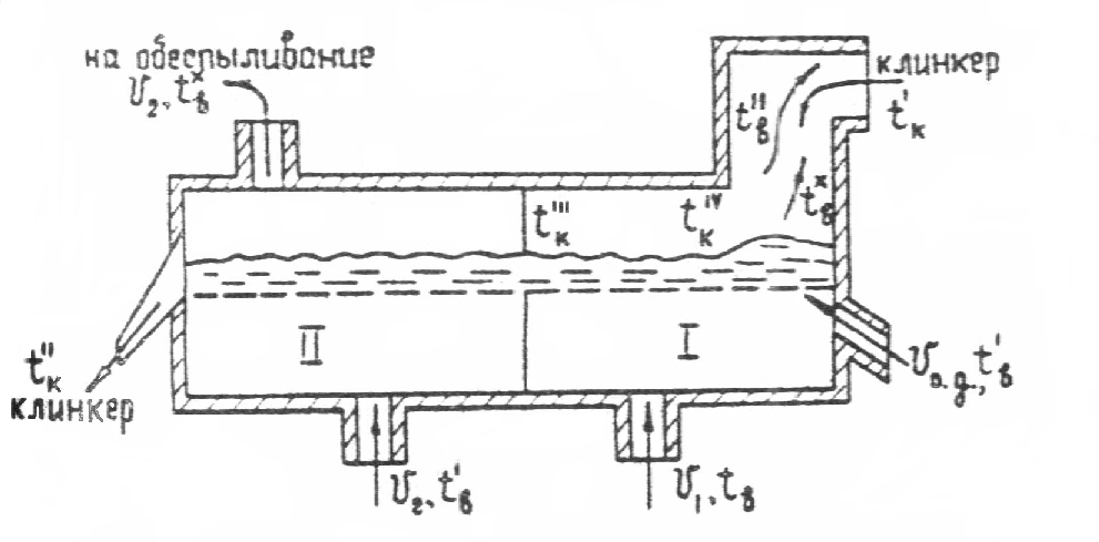 В специальном тепловом расчете был сделан расчет размеров колосникового холодильника: длина 16,6 м; ширина 4,2 м; площадь 69,7 м2. Технологический КПД холодильника 90,7 %. Тепловой КПД холодильника 97,6 %. Полученная в расчете холодильника температура вторичного воздуха поступающего в печь 465 oC меньше температуры принятой в начале расчетов при составлении теплового баланса печи 500 oC, что может привести к увеличению расхода топлива на 0,02 м3/кг кл.
