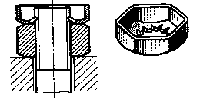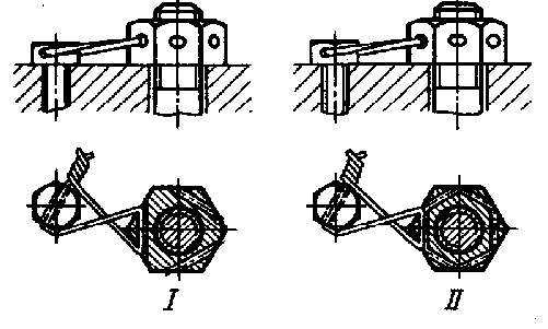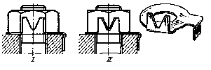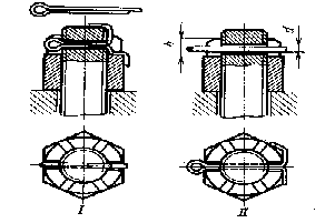 На рис.11 изображены самоконтрящиеся гайки с удлиненной коронкой, целой или разрезной, которая при изготовлении обжимается. При завертывании гайки в момент, когда нарезная часть болта входит в обжатый участок, в резьбе возникает повышенное трение. Гайки с разрезными коронками (рис. 11,II) обеспечивают более надежное стопорение благодаря упругости лепестков коронки.