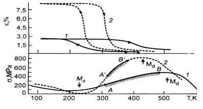 Рис.1 Температурные зависимости эффекта обратимой памяти и предела текучести в пористом (1) и литом (2) сплавах на основе никелида титана.