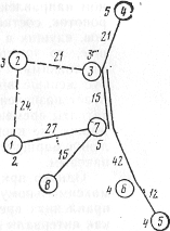 Пусть в рассматриваемом примере задано получить коэффициент не менее 0,82, а на предыдущем этапе расчетов получен коэффициент, равный 0,805, т. е. необходимо сократить число предоставляемых пассажиро-километров. Для этого выбираем маршрут с наибольшим потоком пассажиров и рассматриваем его по отдельным участкам. Таким является маршрут 5-3 (см. рисунок 6). Наибольшая величина пассажиропотока 1521 пасс, на участке 6-7. На других участках в основном направлении эта величина составит 1006 пасс. Таким образом, если установить маршрут 3-5 с расчетным потоком в основном направлении 1006 пасс, и новый маршрут 3-6 (на рисунке 6 он показан штриховой линией) с расчетным потоком в основном направлении, равным 515 пасс. (1521-1006), то количество предоставленных пассажиро-километров сократится на (